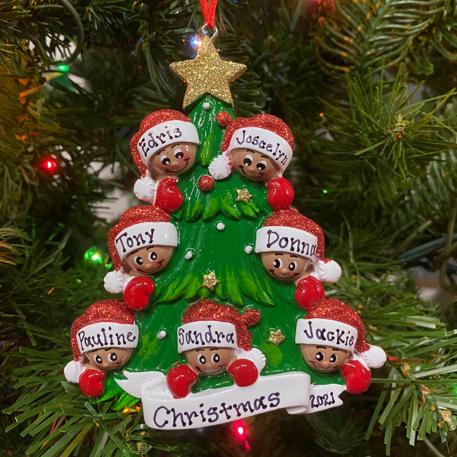 Honor your family with this adorable Christmas ornament! It features 7 smiling faces all wearing hats to get their name written on and a banner at the bottom with space for the family last name! Made of resin. Item #: AA827-7