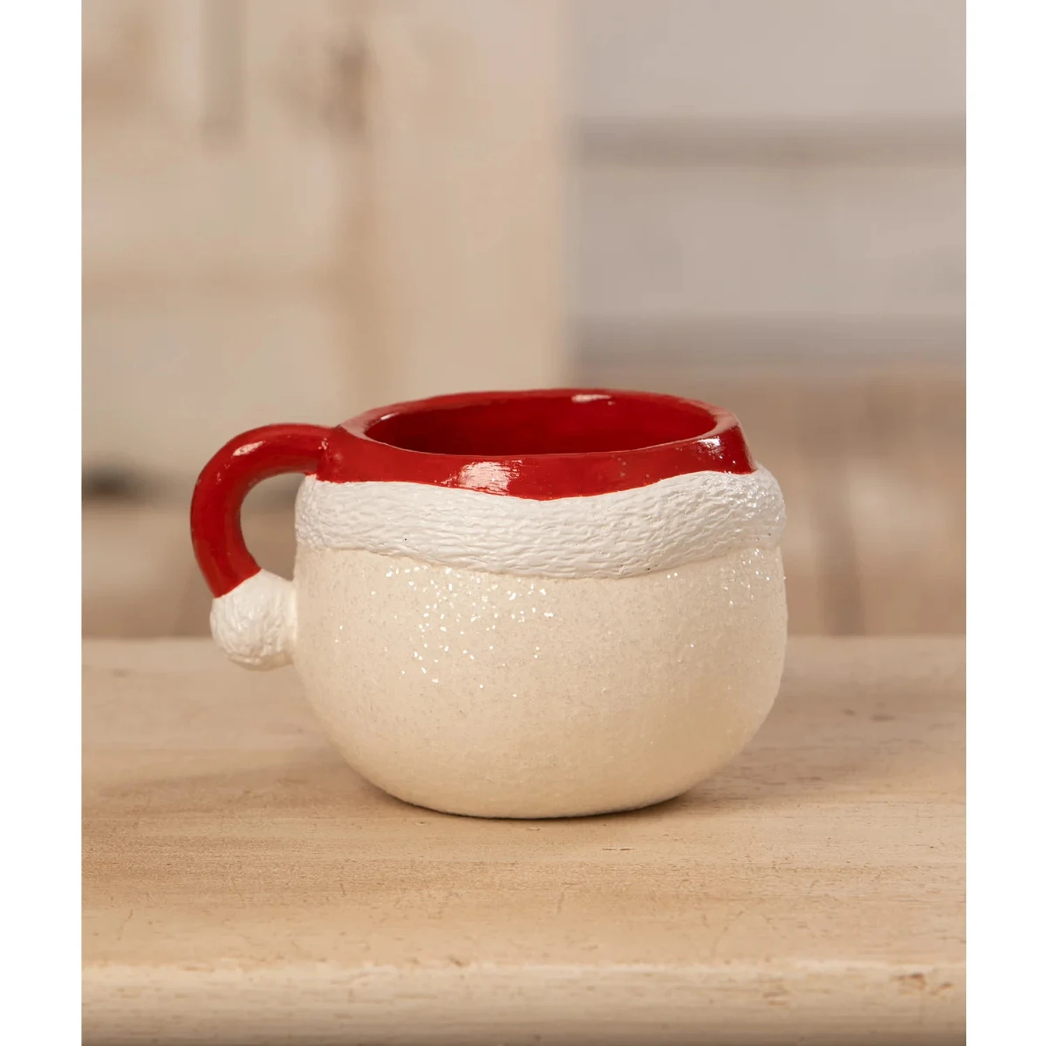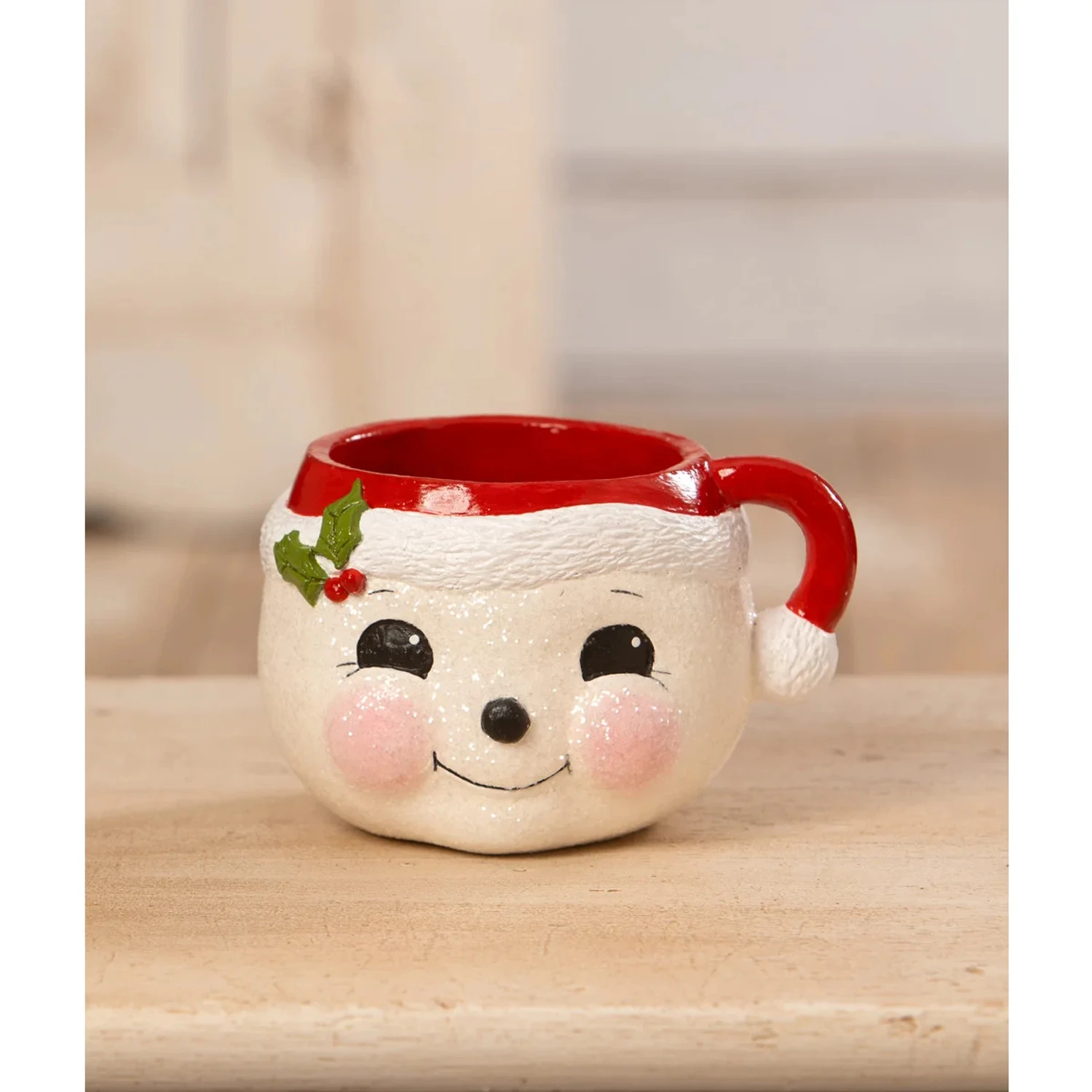 It’s a peppermint party in here! This Christmas mug features an adorable snowman face with deep black eyes and light pink cheeks! The red hat on his head makes the handle of the mug! This mug would be perfect to add a matching bottle brush tree! Not food safe. Made by Bethany Lowe. Made of Hand-painted resin and glitter. Dimensions: 5.25″ X 4.25″ X 3.75″. Item #: TF3274
