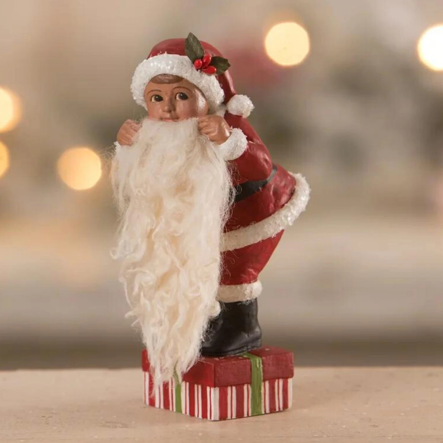 When you were little who was your idol you loved dressing up as? Milo’s is Santa! He wears a red suit with a matching hat and gets ready to wear a beard as he stands on a gift box before attending the Christmas party! Made by Bethany Lowe. Made of hand-painted resin, glitter, and fabric. Dimensions: 3″ x 2.5″ x 5.5″. Item #: TD1173