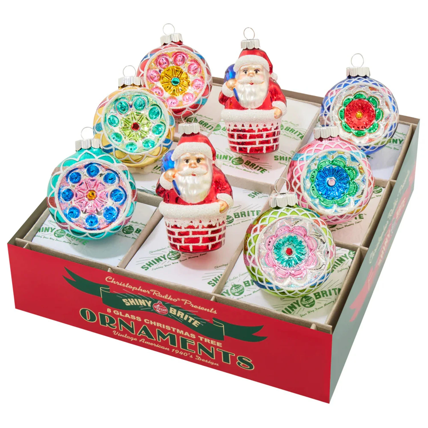 Shiny Brite’s confetti line is full of bright colors that make it a fun and festive addition to your decor! This ornament set features rainbow colored rounds with sparkling reflectors trimmed with white glitter, and a pair of Santa’s shimmying down a red brick chimney! Shiny Brite made by Christopher Radko. Made of glass. Item #: 4028269
