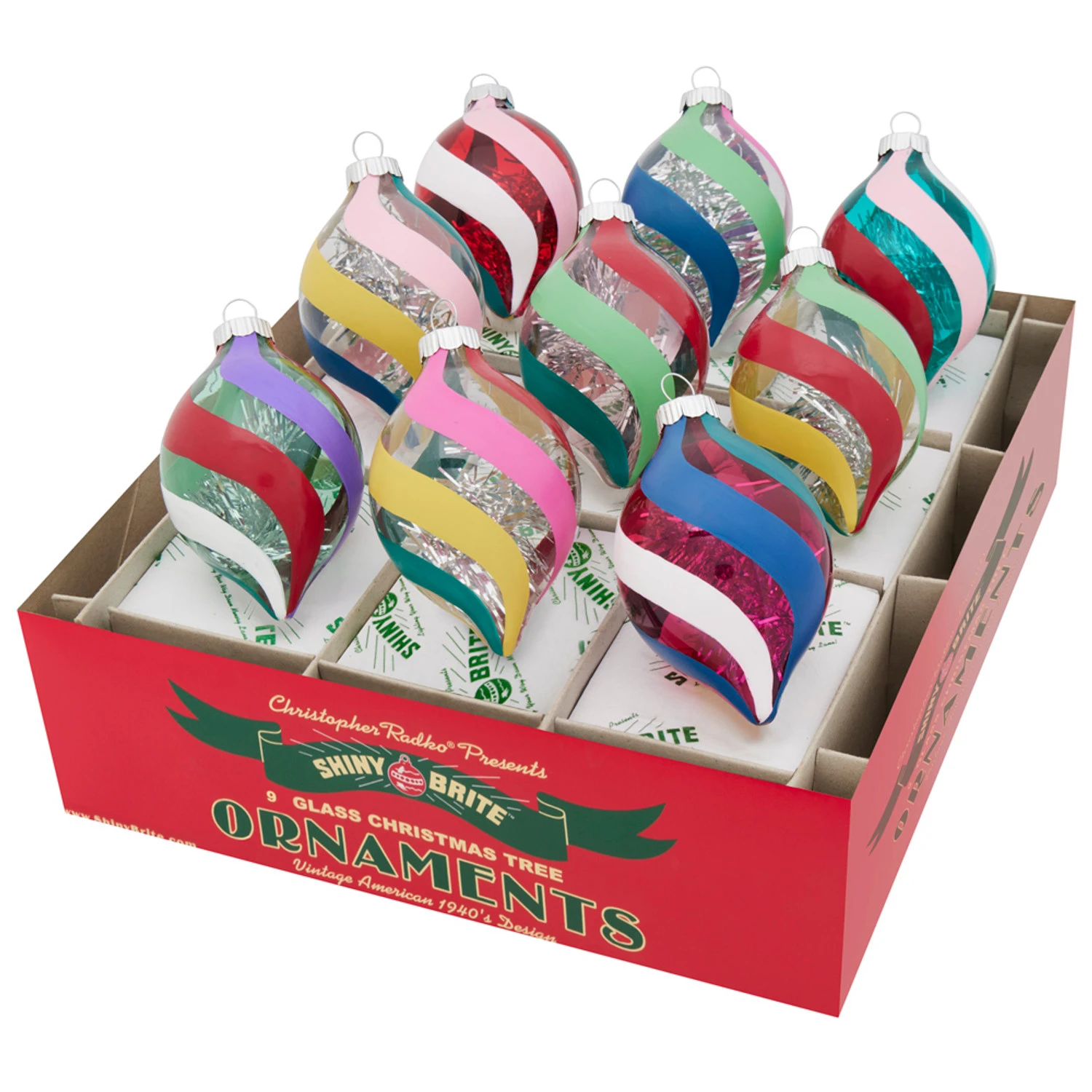 Make your holiday tree sparkle with vintage flair! These 2.5″ tulip-shaped ornaments from the Vivid Vintage collection are crafted from translucent glass and feature swirling stripes in vibrant colors. Each ornament is finished with a sprig of shimmering silver tinsel inside for an extra touch of festive shine. Shiny Brite made by Christopher Radko. Made of glass. Dimensions: 2.5″. Item #: 4028249