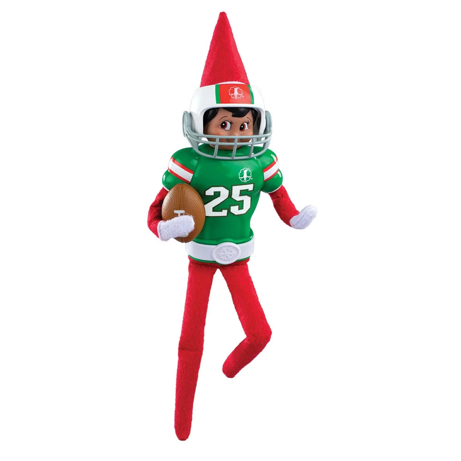 Set…HIKE! Does your scout elf love sports?? They need this awesome football gear set! The set includes a green jersey muscle shirt which matches the white helmet, and a mini football for your elf! Elf not included. Made by Elf On The Shelf. Item #: CCFOOTBALL