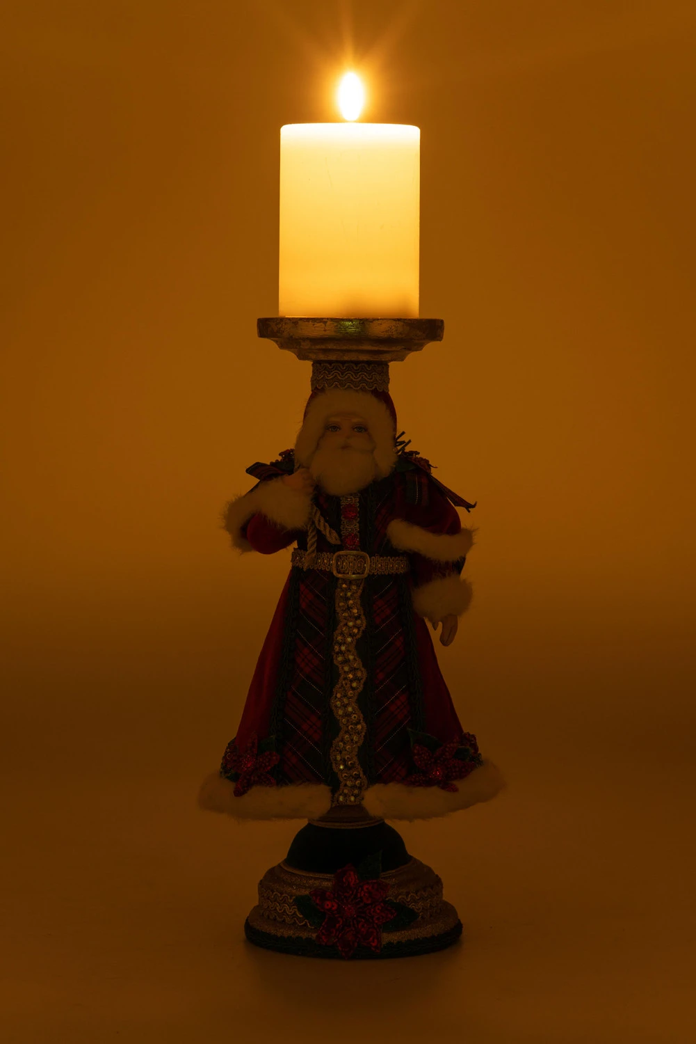Santa is coming to the party dressed to impress! His dark red suit has white fir trim and green embroidery with plaid stripes down the front! Beaded poinsettia blooms sit at the bottom and a gold belt is tied around his waist. He holds a green velvet bag over his shoulder that is filled with toys! He stands on a pedestal made of green and gold and a gold holder is over his head! Includes battery operated candle. Made by Katherine’s Collection. Dimensions: 6.5 × 6.5 × 13.5 in. Item #: 28-428324