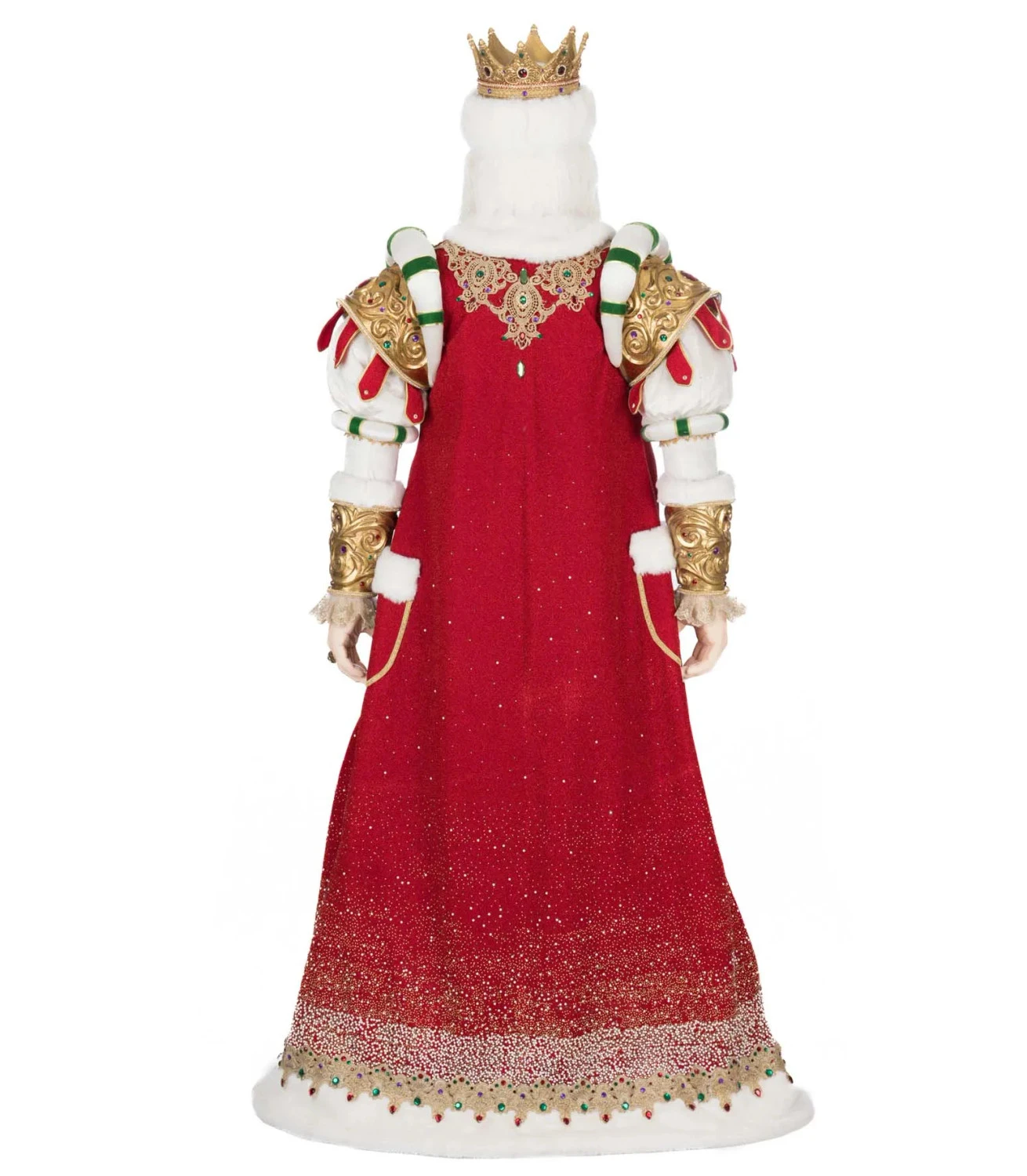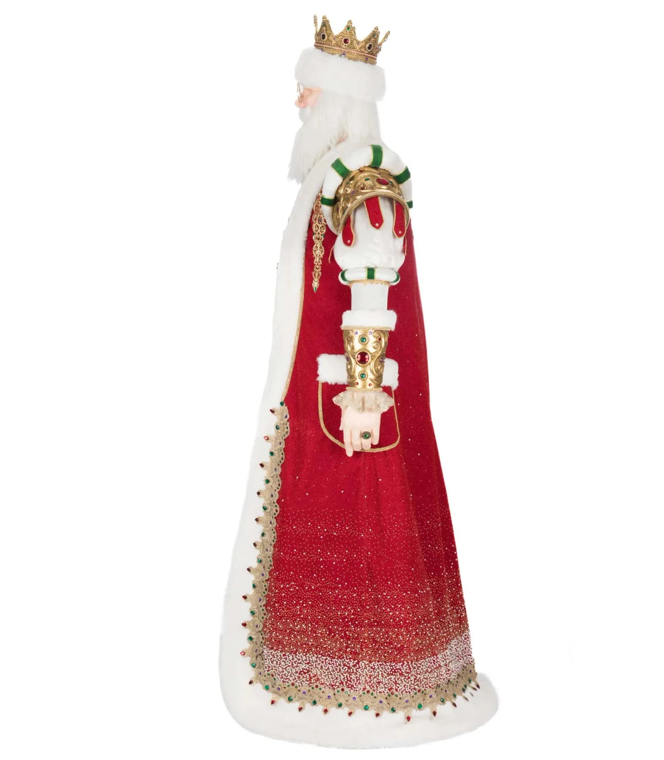 Make a regal statement this holiday season with the life-sized Royal Christmas Ball King Christian Claus from Katherine’s Collection. Santa steps into his royal role wearing a magnificent red floor-length cape with a shimmering gold ombré effect and luxurious white fur trim. His dramatic balloon sleeves are adorned with gold armor-inspired detailing at the shoulders and cuffs, accented by festive red and green stripes. A richly embroidered red vest with jeweled buttons and a classic black belt sits atop striped green trousers, while gleaming gold boots embellished with jewels complete his majestic look. This grand display figure brings the magic of Christmas—and the presence of Santa himself—right into your holiday celebration. Made by Katherine’s Collection. Dimensions: 25 × 11 × 71 in. Item #: 28-528809