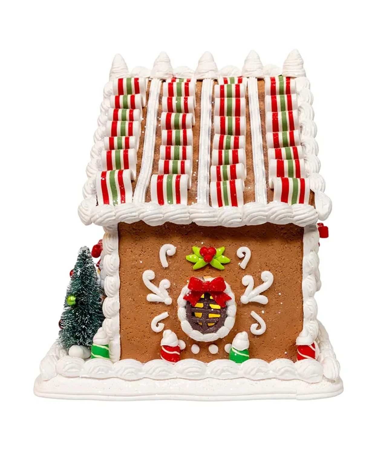 Step into a sweet holiday dream with this enchanting 9″ LED gingerbread house from Kurt Adler! Featuring golden brown cookie walls adorned with intricate white icing, the roof is trimmed with red and green swirling ribbon candy for a whimsical touch. A cheerful Santa face takes center stage, framed with holly accents and delicate shell piping. Bows and wreaths decorate the windows and doors, while the front entry is flanked by bottle brush trees and vibrant candy-inspired trees—perfect for adding a magical glow to your Christmas décor. Battery operated. Made by Kurt Adler. Made of claydough. Dimensions: 9″. Item #: GBJ0059