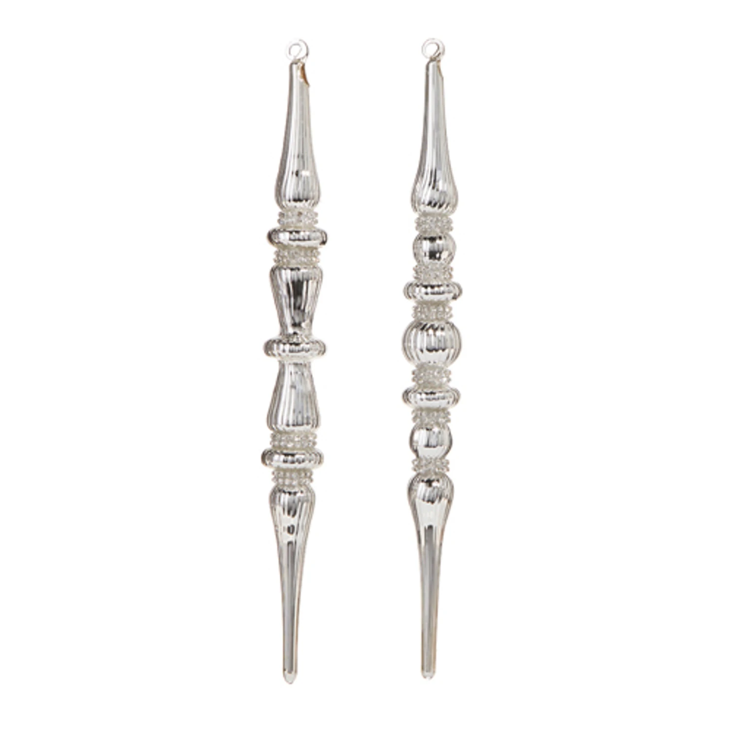 Elegance and sparkle? We got you! This pair of ornaments feature shiny silver finial shapes adorned with sparkling jewels! They are sure to look gorgeous hanging on the tips of your Christmas tree! Made by Raz Imports. Made of glass. Dimensions: 12″. Item #: 4324599