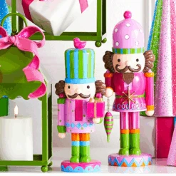 With cute little faces and blushing cheeks, each nutcracker wears a uniform made up of bold and bright colors with gold accents. Each holding a dangling finial and a present! Sold as a set of 2. Made by Raz Imports. Made of resin. Dimensions: 5″L X 4″W X 13.5″H; 4.5″L X 4″W X 11.5″H. Item #: 4510544