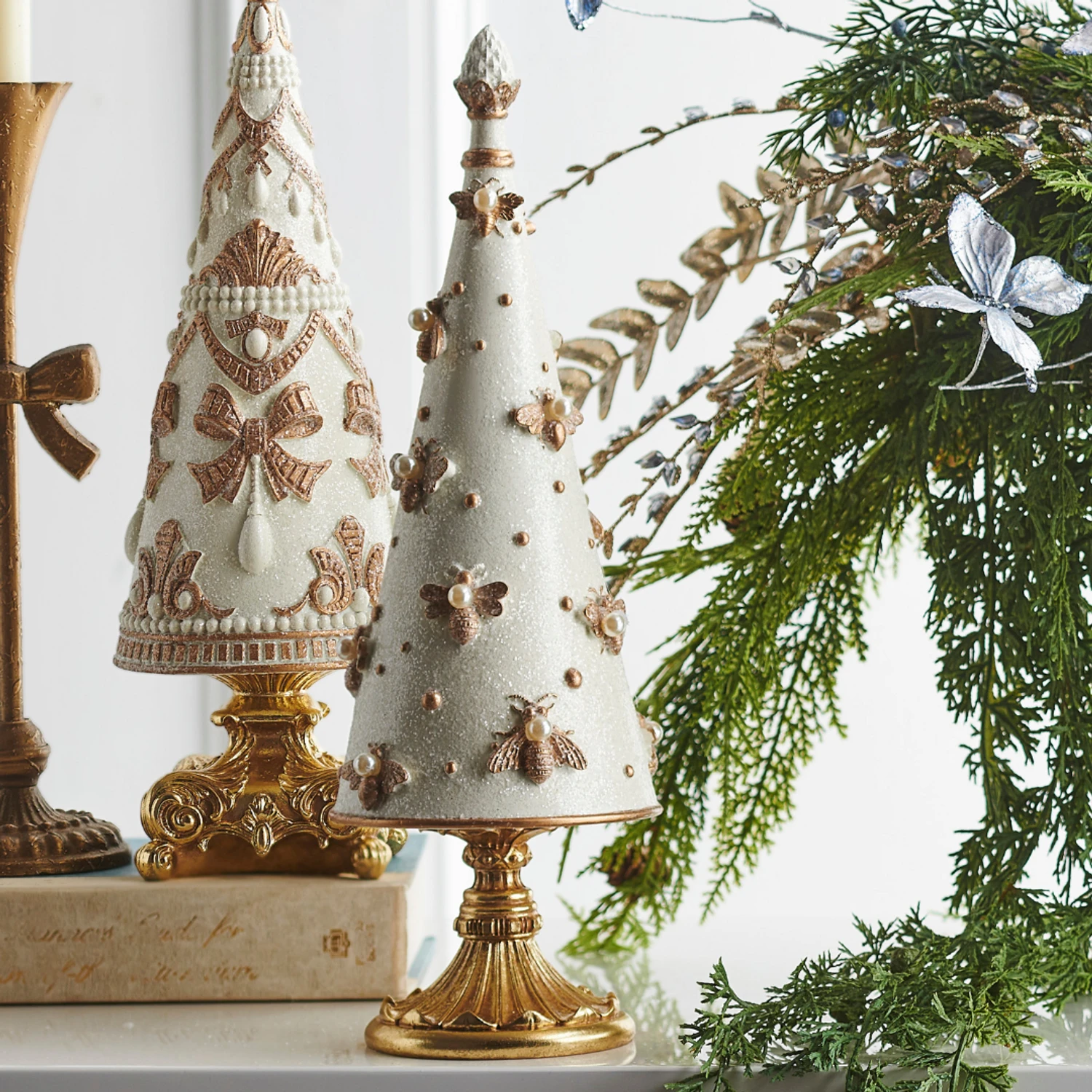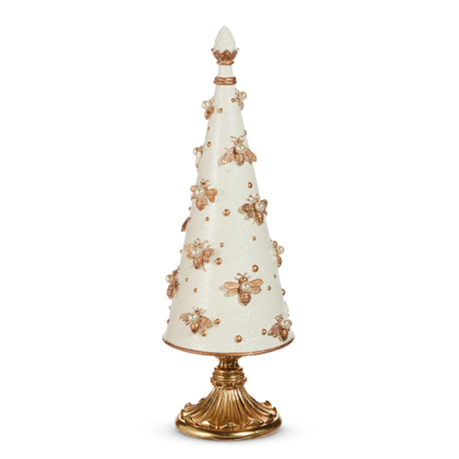 Add a touch of regal charm to your holiday décor with this stunning 15.5″ ivory cone tree, beautifully adorned with golden bee accents and delicate pearl details throughout. Topped with a small pine cone and resting on an ornate circular base, this unique piece brings a sophisticated and nature-inspired elegance to mantels, tabletops, or festive displays. Made by Raz Imports. Made of resin. Dimensions: 5.5″ D X 15.5″ H. Item #: 4510475