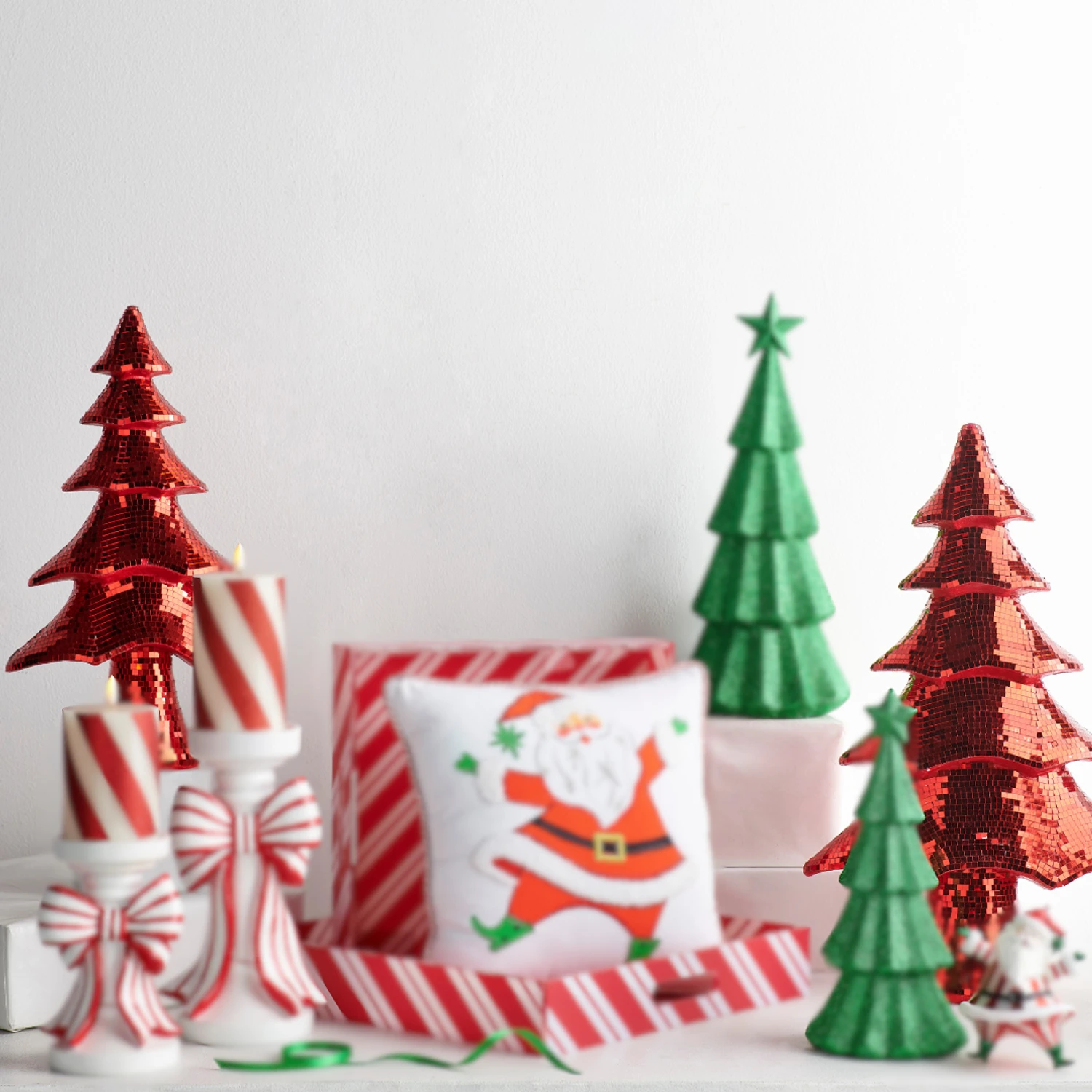 Twist and shout for these gorgeous red disco trees! Each one is covered in teeny tiny red mirror tiles and is sure to make a statement in your home this holiday! Sold as a set of 2. Made by Raz Imports. Made of glass, foam, and polyester. Dimensions: 12″L X 5″W X 20″H; 9″L X 4″W X 16.25″H. Item #: 4554054