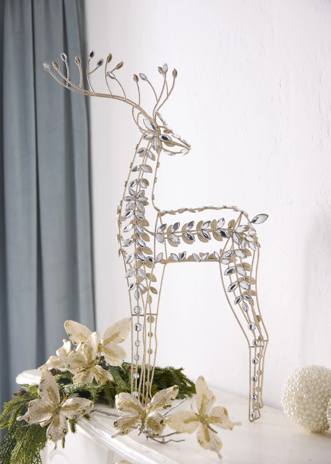Add a touch of sparkle and sophistication to your holiday décor with this jeweled standing deer. Crafted from a sturdy iron frame, the figure is coated in shimmering silver glitter and adorned with dazzling jewels from its hooves all the way to its whimsical antlers. A stunning statement piece, this deer is perfect for displaying by your Christmas tree, fireplace, or entryway to welcome guests with festive elegance. Made by Raz Imports. Made of metal and plastic. Dimensions: 18.5″ L X 4″ W X 27″ H. Item #: 4513524