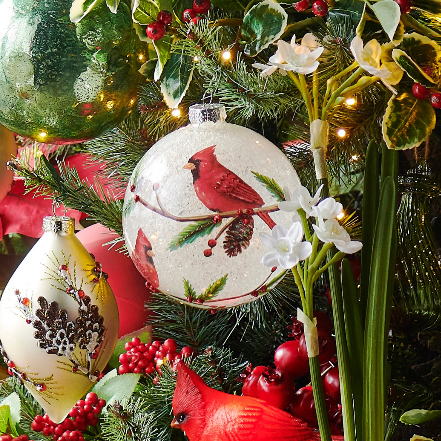Caught in the midst of falling snow, a pair of bright red cardinals are decorated in red glitter as they both perch on a pine branch accented with red berries and pine cones! The ball ornament is made to look like it’s filled with snow and is sure to look fabulous on your Christmas tree! Made by Raz Imports. Made of glass. Dimensions: 5″. Item #: 4524553