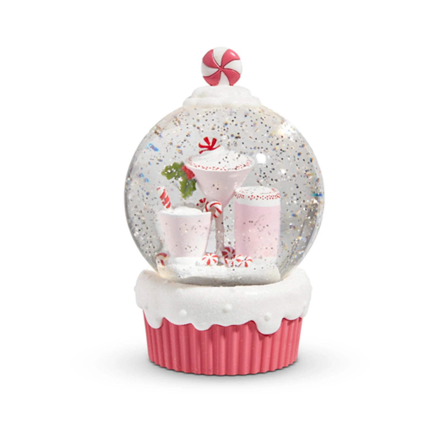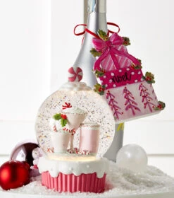 What’s sweeter than a fresh made cocktail on Christmas Eve? This pink-a-licious cupcake Christmas water globe features a magenta base that looks like a ribbed cupcake wrapper dripping with white icing topped with a clear globe! Inside, is a trio of pale pink frosty cocktails decorated with peppermint candies and swirling flecks of silver glitter! On the top sits a dollop of white icing and a pink peppermint candy! Requires 3 AA Batteries. 6 Hour Timer Repeats Every 18 Hours. Continuous Swirling Glitter, Gently Flip To Loosen Glitter, To Avoid Damage Do Not Shake. Made by Raz Imports. Made of plastic and resin. Dimensions: 5″ D X 7.75″ H. Item #: 4400768Â