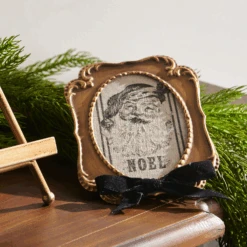 Santa is depicted in a black ink stamp-style image framed with an ornate gold frame accented with a soft black velvet bow! This ornament is the perfect addition to your old world or farmhouse decorated Christmas tree. Made by Raz Imports. Made of Iron, MDF, Velvet and Linen. Dimensions: 5.25″ L X 0.5″ W X 7″ H. Item #: 4521360