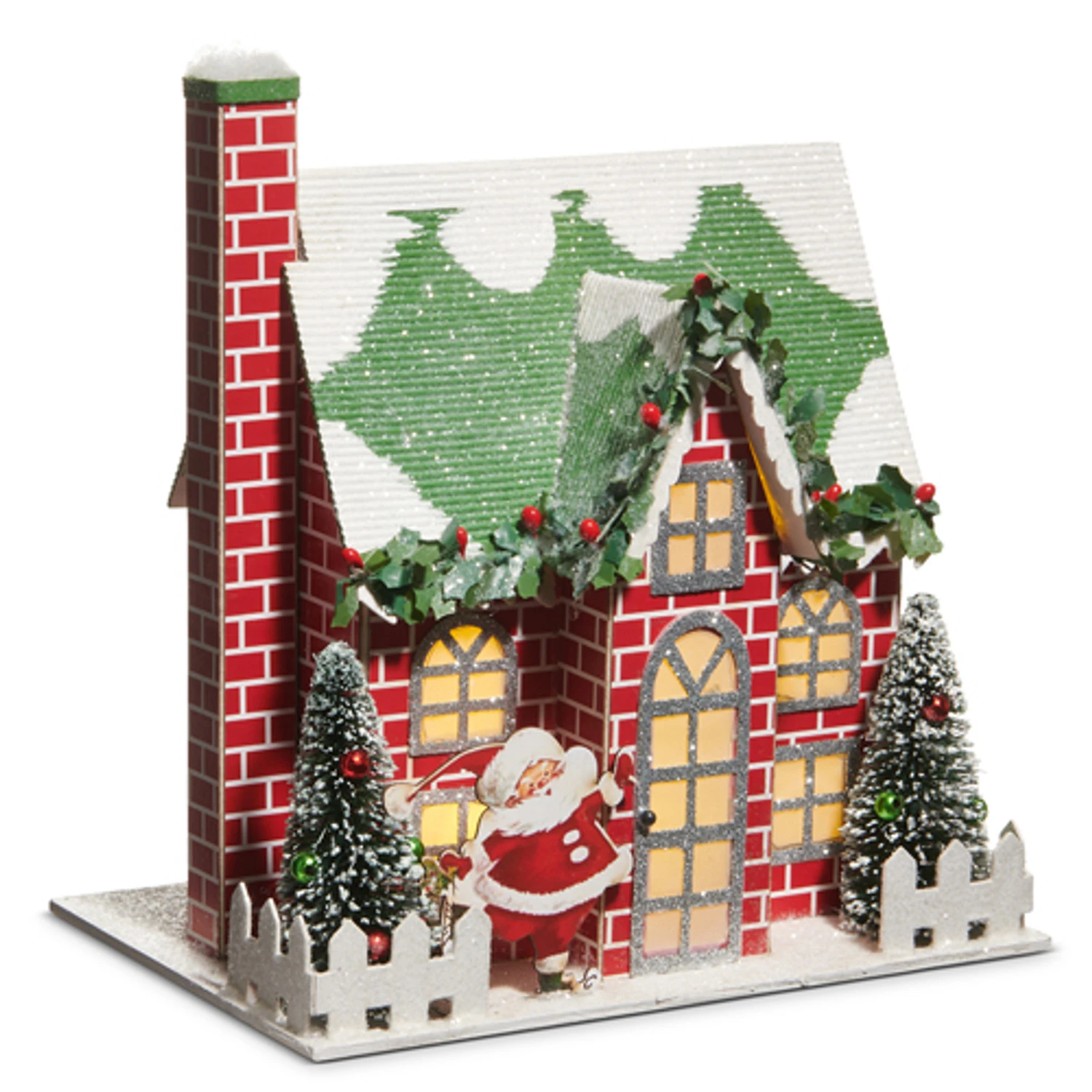Bring nostalgic charm to your holiday décor with this delightful lighted brick house! Covered in classic red and white brick, the vintage-style home features a crinkled green roof dusted with sparkling glitter and snow. Silver glitter trims the windows and door, while a festive holly garland accents the roof’s peak. Out front, a cheerful vintage Santa stands beside sisal bottle brush trees, ready to welcome the season with holiday spirit. Perfect for mantles, shelves, or your Christmas village display! Requires 3 Lr44 Batteries. 6 Hour Timer Repeats Every 18 Hours. Made by Raz Imports. Made of paper, plastic, and sisal. Dimensions: 8.75″ L X 6.5″ W X 9″ H. Item #: 4519184
