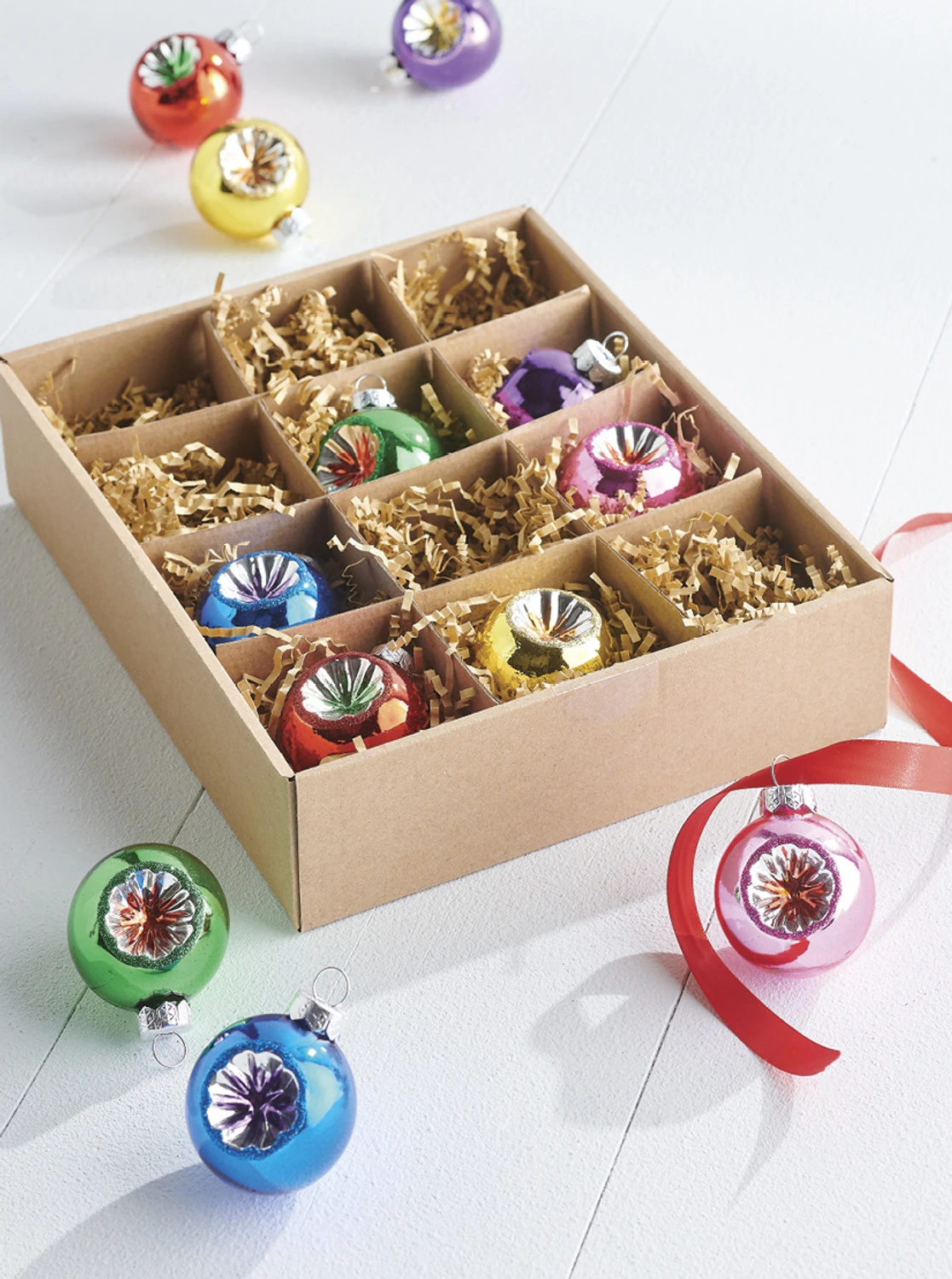 Bring a bit of nostalgia to your home this holiday season! This set features an array of bright colored glass ball ornaments with colorful reflectors and a touch of glitter! They are great to hang on a mini tree or use to dot all over your regular tree, wreath, or garland! Made by Raz Imports. Made of glass. Dimensions: box of 12 ornament, each ornament is 2″ tall. Item #: 4220974