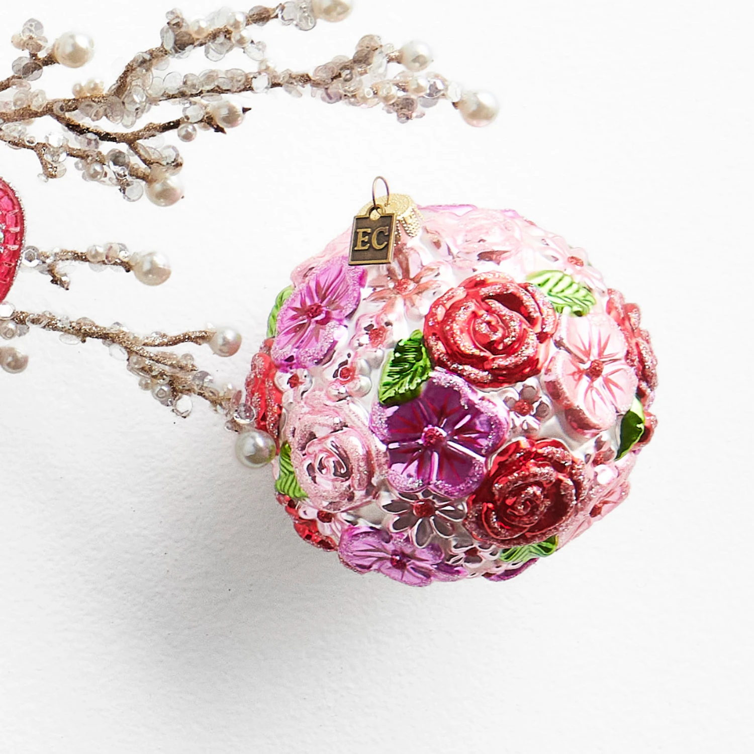 Spring into Christmas with this stunning garden ball ornament! It features an array of different floral blooms accented with sparkling glitter and bright green leaves! Made by Raz Imports. Made of glass. Dimensions: 4″. Item #: 4553174
