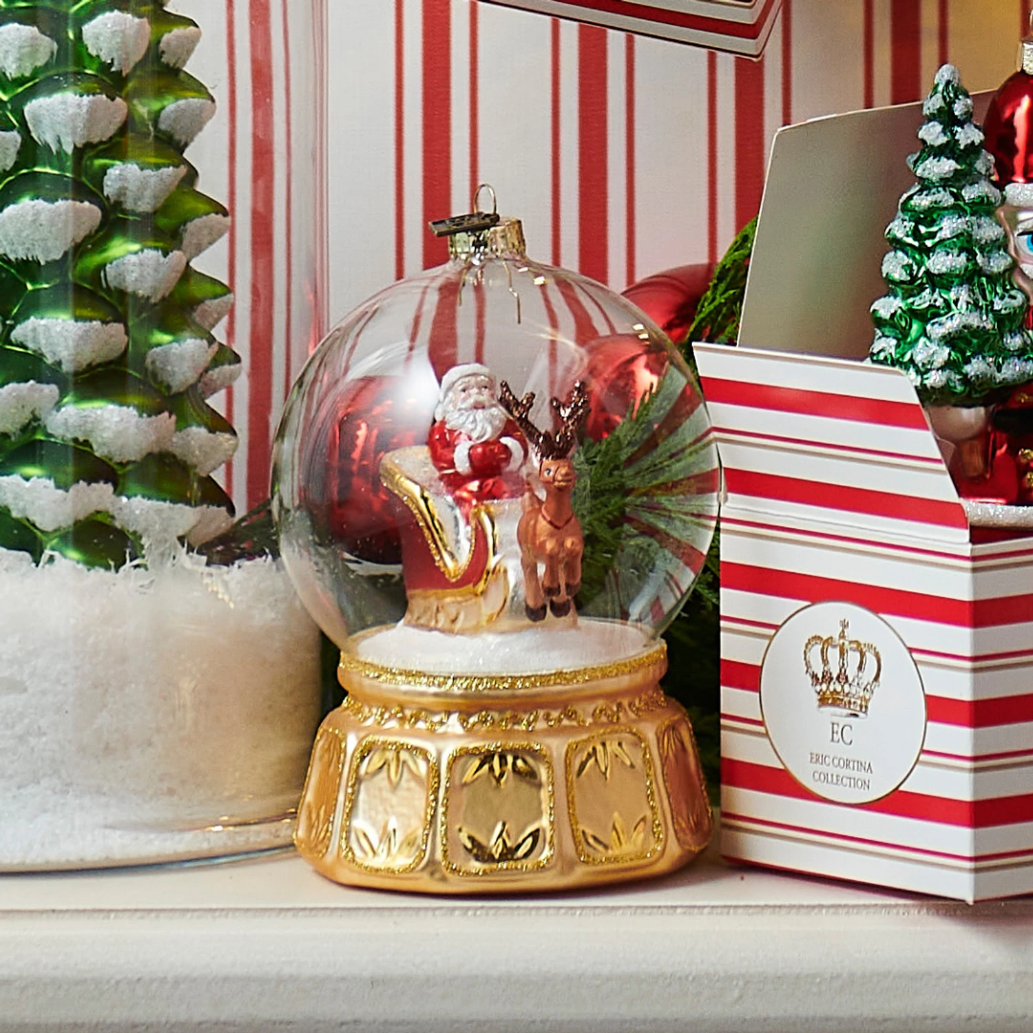 The Snow Globe Express ornament from Eric Cortina captures Santa in a whimsical mid-flight scene. Set inside a golden-based globe, Santa rides in a red and gold sleigh pulled by a reindeer that bursts playfully from the glass. With its detailed craftsmanship and vintage-inspired charm, this collectible piece makes a stunning addition to your Christmas tree or a curated holiday display, and is a keepsake you’ll enjoy for years to come. Made by Raz Imports. Made of glass. Dimensions: 5″ L X 4″ W X 5.5″ H. Item #: 4553106
