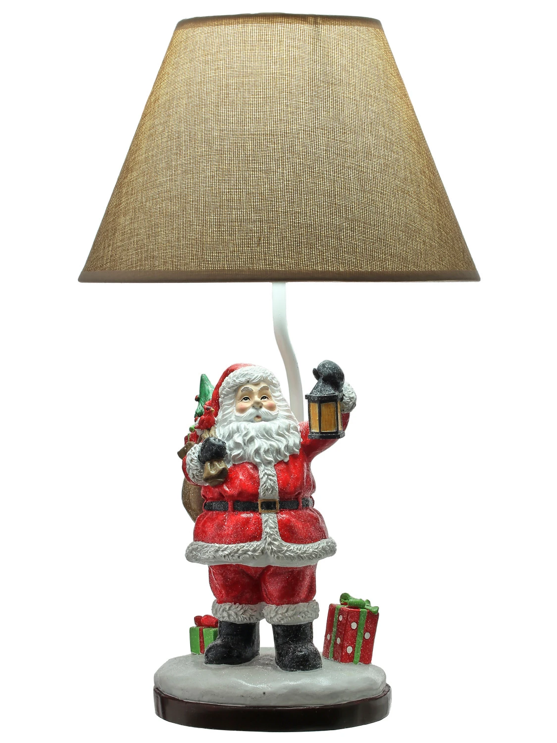 Making his way to load the sleigh on Christmas night, Santa wears a red suit with a lantern in one hand while the other holds a large toy bag that is slung over his shoulder behind him! This fun woodland Santa lamp is sure to look fabulous in place of your every day lamp for the holidays! Made by Regency International. Made of resin and metal. Dimensions: 27″. Item #: MTX66180Â